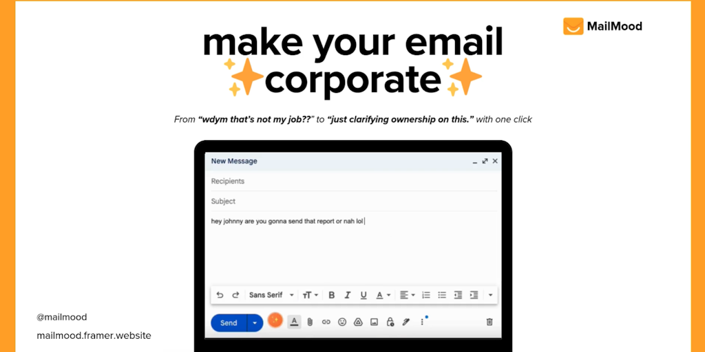 MailMood is a Chrome extension that rewrites your emails in clean, confident, modern business language — in one click. Whether your tone is too casual, aggressive, or awkward, MailMood makes you sound