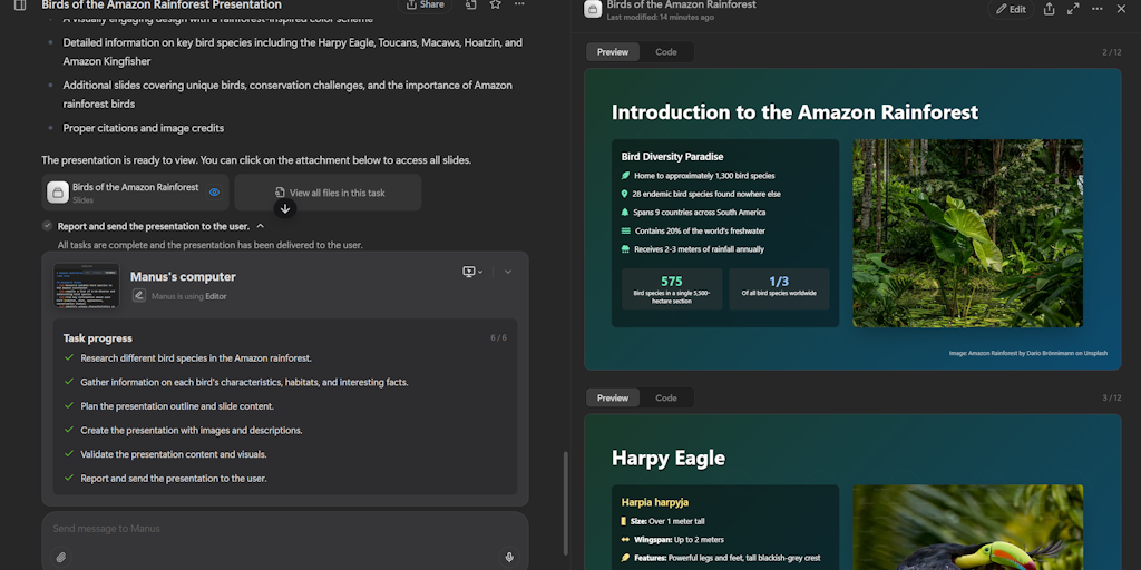 Manus is a general AI agent that turns your thoughts into actions. It excels at various tasks in work and life, getting everything done while you rest.