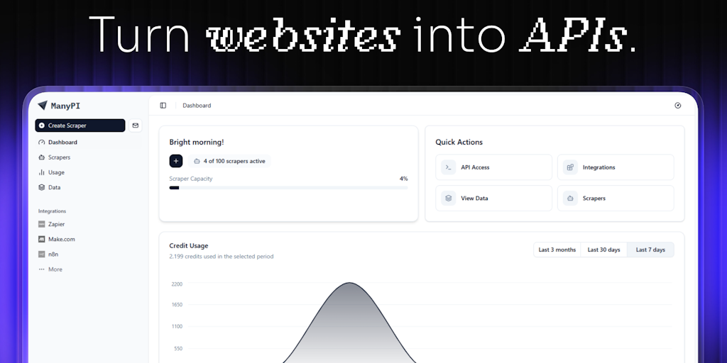 Convert any website into a clean, type-safe API. Use natural-language or JSON-schema prompts to extract data and get usable JSON output for RAG pipelines, sales, content aggregation, or research.