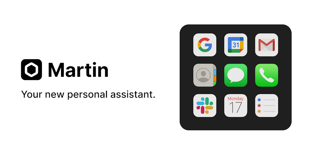Martin manages your calendar, inbox, to-do lists, and Slack. He can send texts, make calls, set reminders, and search the web for you.