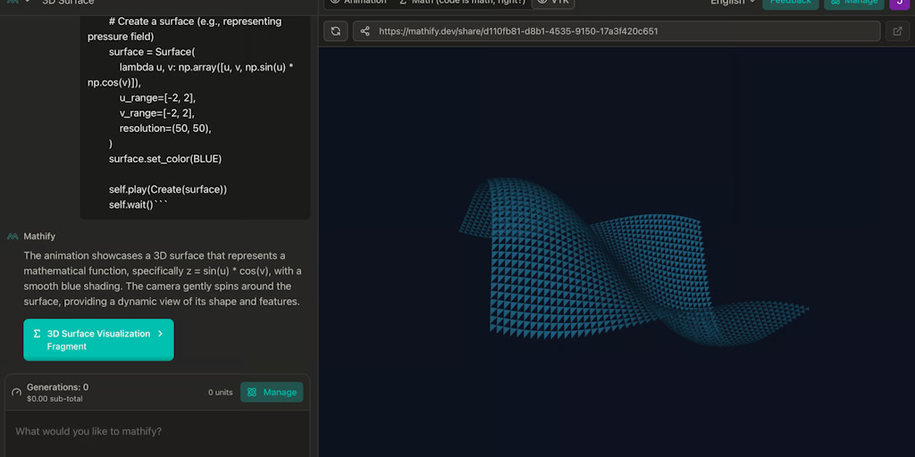 Mathify is a new way to create math and physics animations with AI. Instead of writing Manim scripts or setting up render pipelines, you just describe your idea and Mathify generates the code, renders
