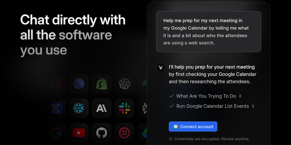 MCP Chat enables you to chat with your software across 2700+ APIs & MCP servers with 10k+ tools. It includes built-in authentication management and tool discovery, and works with any LLM or framework.