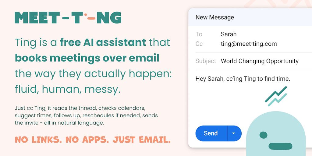 Ting is a free AI assistant that books meetings in email the way they really happen - human, messy. Just CC Ting - it reads the thread, checks calendars, suggests times, and sends the invite. Like Cal