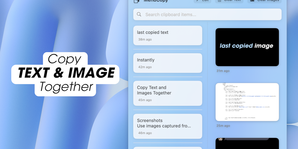 MenuCopy is a clipboard manager for macOS that allows you to simultaneously view and instantly copy your most recently saved text and image from the menu bar. Designed for productivity, it keeps your