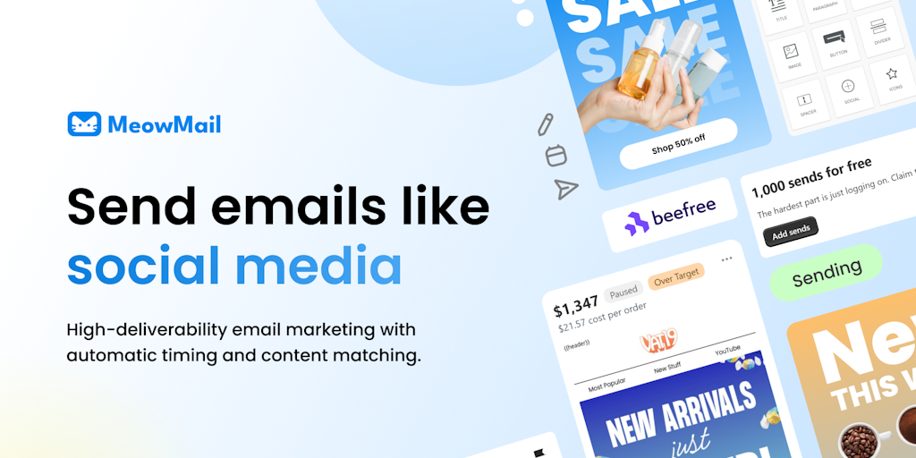 MeowMail AI: High-deliverability email marketing with automatic timing and matching. Cost-effective with up to 31K/month free sends and no monthly or contact fees. Import from Klaviyo or build directl