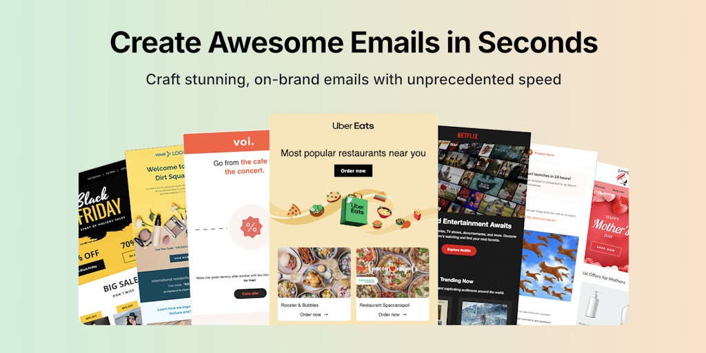 Just say "Create a Black Friday email" and get on-brand email, in multiple languages, fully responsive and compatible with outlook and major clients. Export to HubSpot, Klaviyo, MailChimp. Connect you