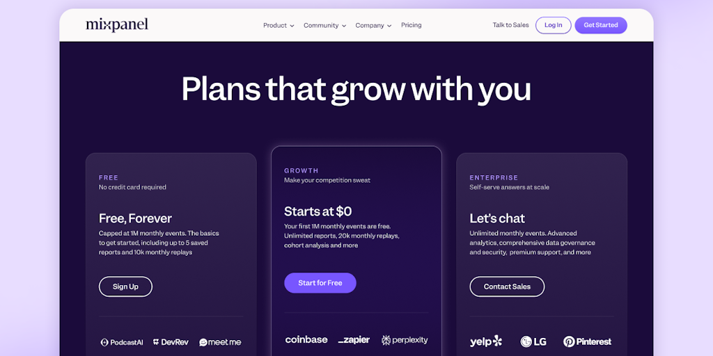 No more getting stuck on arbitrary feature limits: get 1M events free on Mixpanel's Growth plan by simply putting down a credit card. We've made our pricing 100x cheaper — because we're done being par