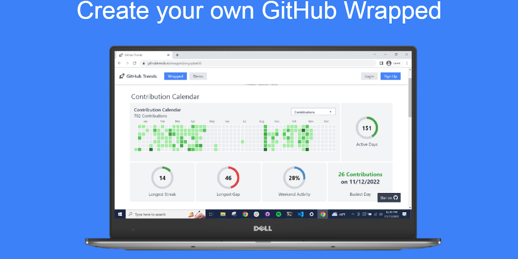 With Spotify Wrapped all over social media, I created GitHub Trends to view and share your own (unofficial) GitHub Wrapped! See your repositories and languages sorted by lines of code, your activity g