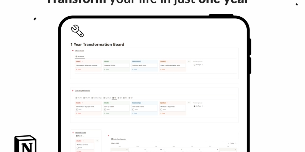 A dashboard designed to help you break down and achieve your goals in just one year, right within Notion. No need to overcomplicate things anymore.