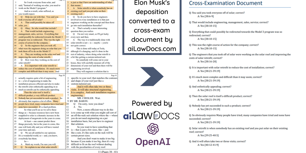 Powered by OpenAI, aiLawDocs.com provides a revolutionary solution to dramatically reduce the cost of trial preparation and eliminate the tedium of drafting direct and cross-examinations.