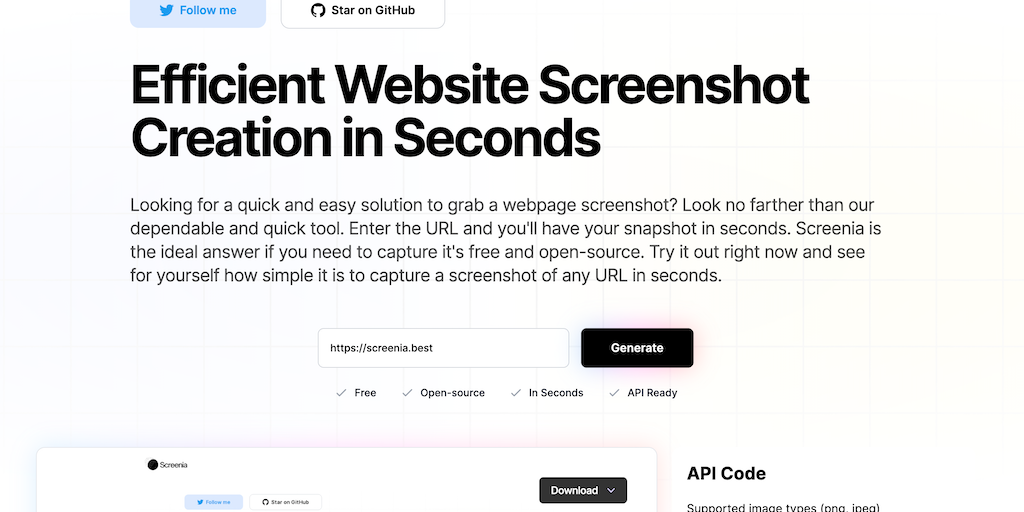 Screenia is a reliable and fast solution for capturing webpage screenshots. Simply enter the URL and get your snapshot in seconds. It's free and open-source, making it the ideal choice for anyone in n
