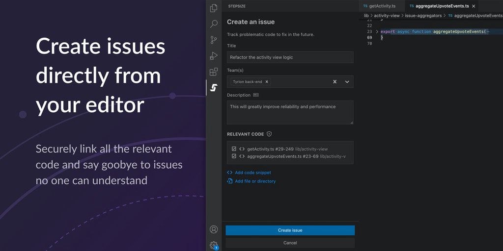 Stepsize is an editor-first issue tracker for a healthier codebase. Create, prioritise, and fix code issues directly from your editor — perfect for tech debt and refactoring. Integrates with Jira, GitHub, Slack, etc. so you don’t need to change your workflow.