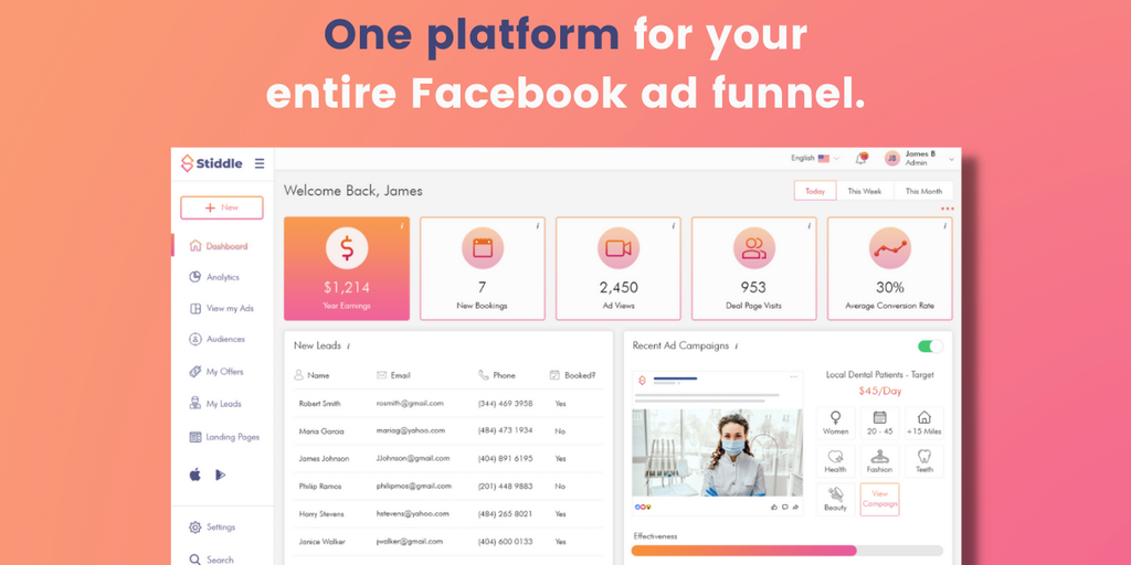 Stiddle helps you create and deploy full-funnel Facebook ad campaigns in minutes from finding your ideal target audience, creating high-converting offers for your niche, generating graphics to custom