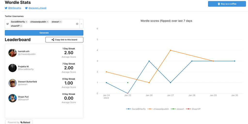Playing Wordle and sharing on Twitter regularly? Can't keep track of performance? Want to compare with your friends? wordlestats.xyz is for you! With WordleStats you can: 1. See your daily performance