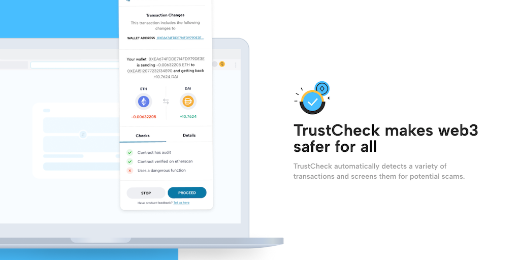 TrustCheck is a free, zero-click browser extension that runs checks at multiple points during your web3 transactions providing you with an easy-to-understand warning if a scam is detected.