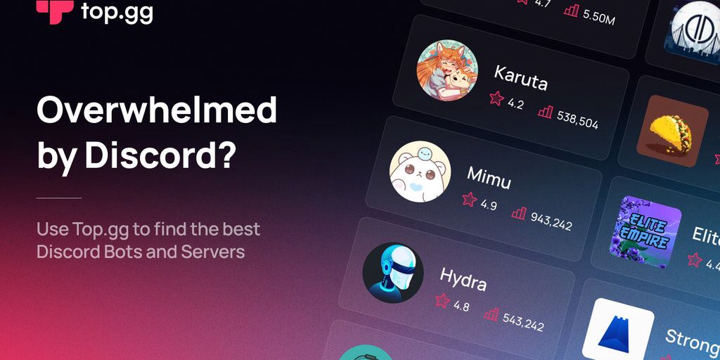 Overwhelmed by Discord? Find the best Discord bots and servers on Top.gg. We are a safe and trusted place with active moderation. For Discord creators it’s the equivalent of Product Hunt!