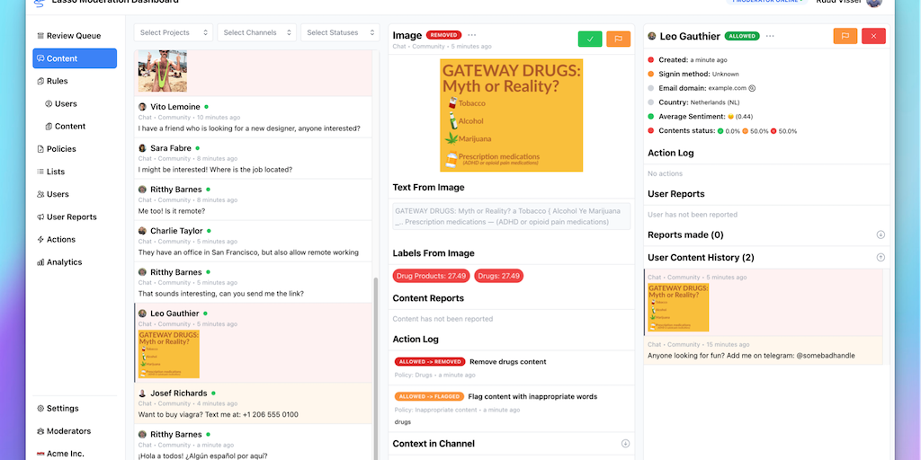 Lasso Content Moderation is an AI-powered solution designed to streamline the content moderation process. Our platform offers an intuitive dashboard and a seamless API integration, providing a full mo