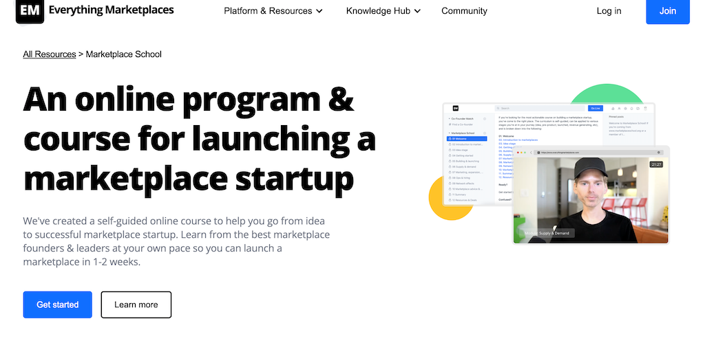 Marketplace School is a self-guided online course that walks you through every step along the way of going from idea, launch, to even considerations when scaling a marketplace. Learn from the best mar