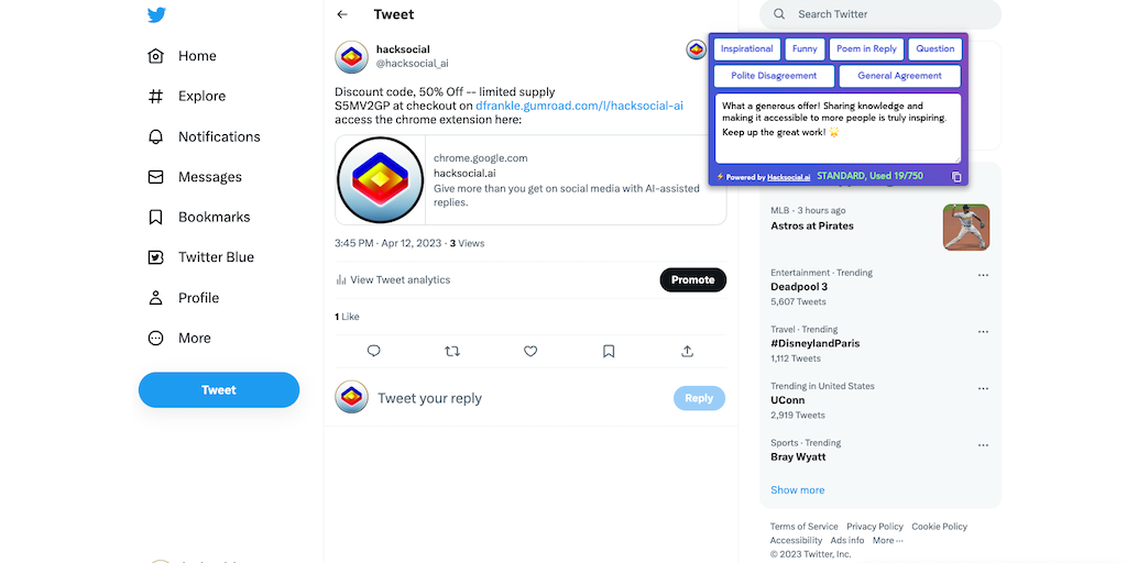 Supercharge your social media experience with AI-powered replies from Hacksocial.ai! Engage your audience, grow your network faster, and never face writer's block again. Transform your interactions on