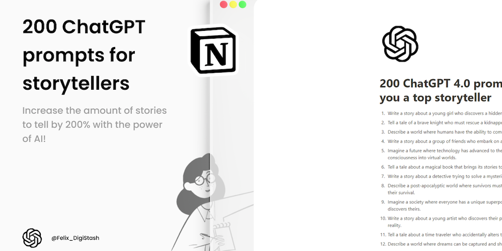 Want to be an awesome storyteller and leave your audience in awe? But you often run out of ideas? Have these 200 ChatGPT 4.0 prompts to give you a whole new pool of ideas to write about!