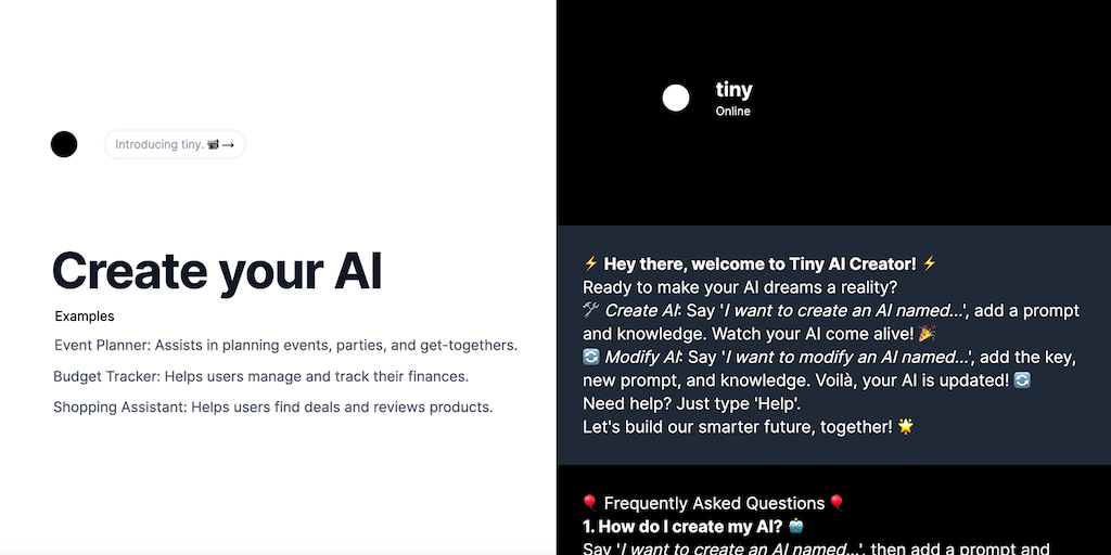 Super fun simple tool to create your own AI – just write 'I want to create an AI named...', add a prompt and knowledge. Watch your AI come alive! Give it a try its great!