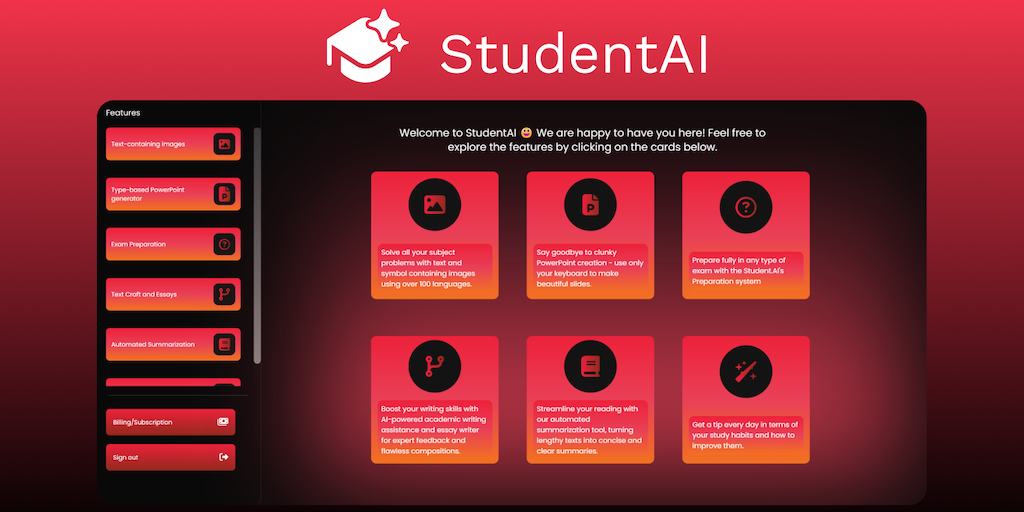 Student AI contains every tool a student will ever need to save them from long hours of work along with excelling academically. From creating presentations to preparing you for an exam, we’ve got it a
