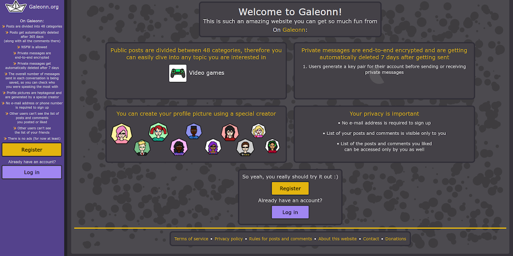Galeonn is a social media platform with categorized posts, end-to-end encrypted private messages and unique profile picture creator. It was designed to be a fun place where you can make new friends an