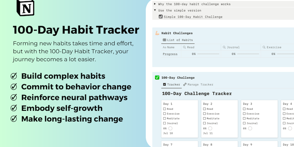 Forming new habits takes time and effort, but with the 100-Day Habit Tracker, your journey becomes a lot easier. Embrace a more realistic approach and rewire your neural pathways building habits that
