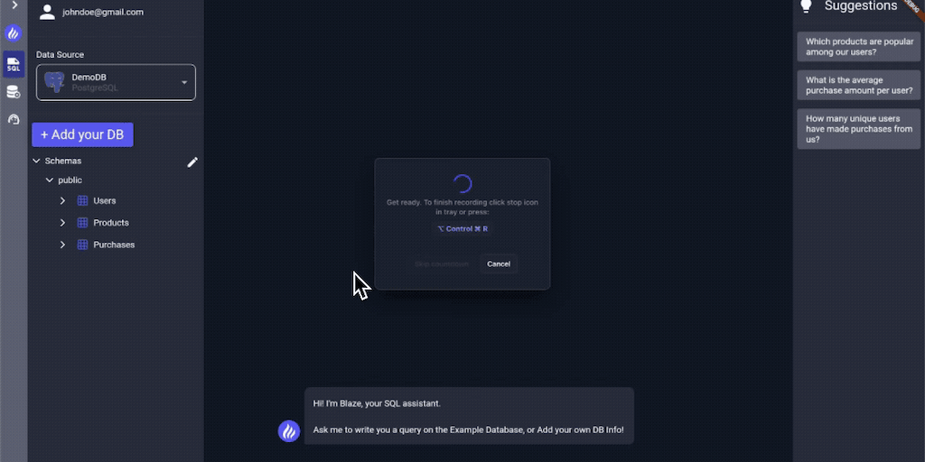 Simply add your DB info, and tell the chatbot what you want. Blaze will generate queries on demand, and even suggest things to analyze.