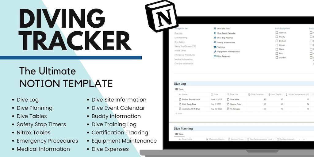 Enhance your diving experience with the Ultimate Diving Tracker template. From recording dive details to tracking certifications and expenses, this comprehensive Notion template allows you to streamli