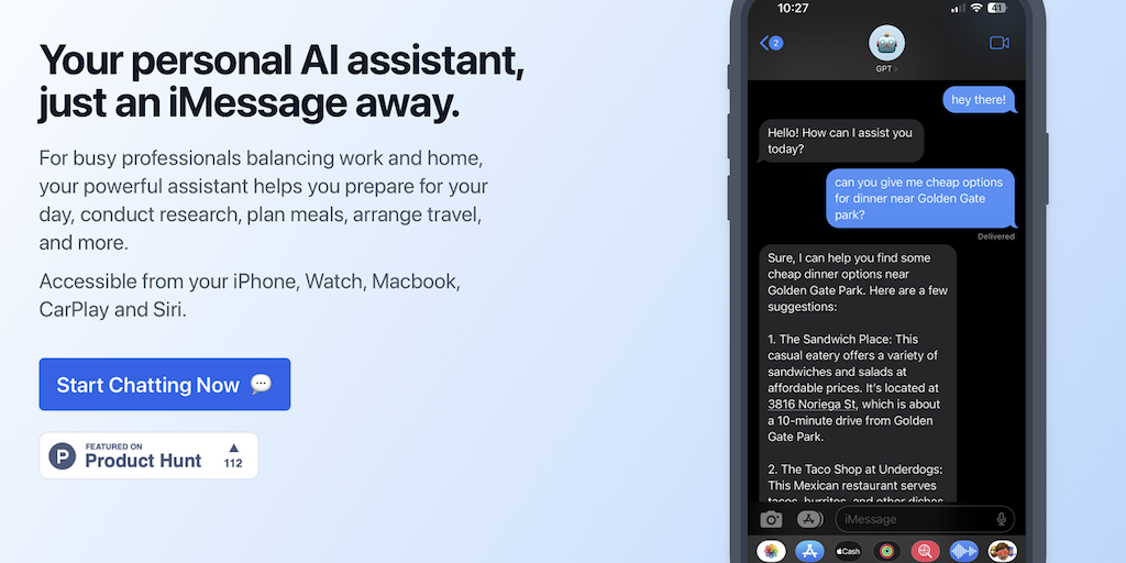 iChatWithGPT - Personal AI assistant in iMessage. Browsing, reminders, .. | Product Hunt