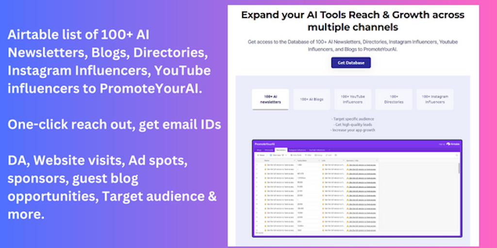 Get access to a database of - 100+ AI Newsletters - 100+ AI Blogs - 100+ AI directories - 100+ AI Instagram Influencers - 100+ AI YouTube Influencers. PromoteYourAI and expand your AI tool reach and g