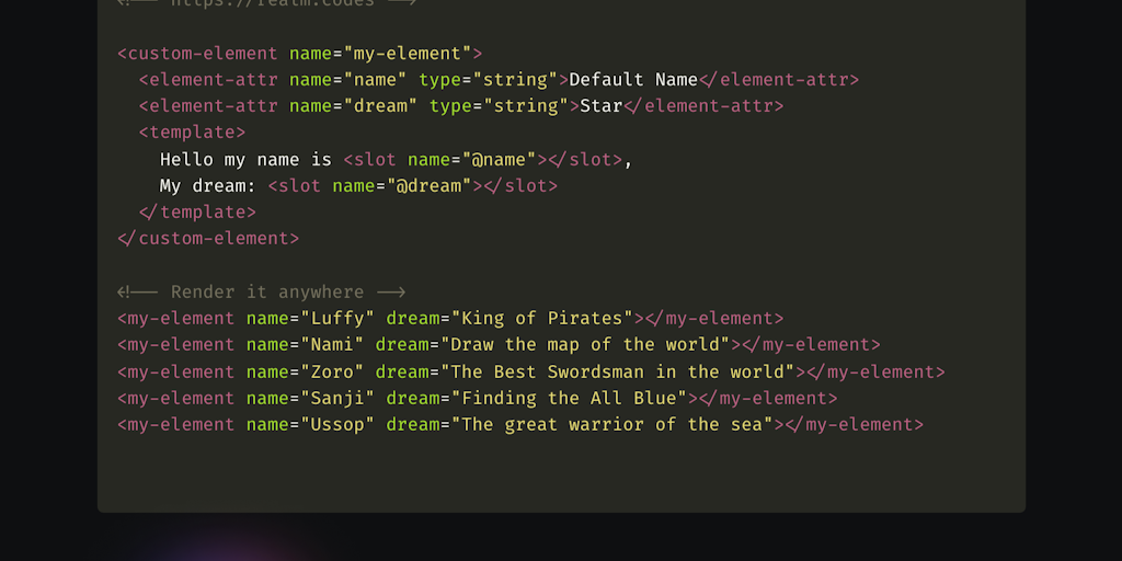 Realm, the open-source framework, stands for Reactive-Lightweight Markup Language. This HTML framework embraces the power of web components, allowing you to achieve remarkable results with minimal Jav