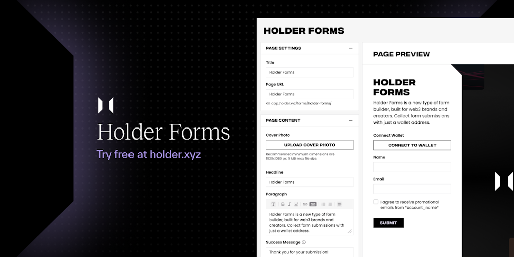 Holder Forms is a new type of form builder, built for web3 brands and creators. Collect form submissions with just a wallet address. Build a wallet subscription, capture event registrations, connect o