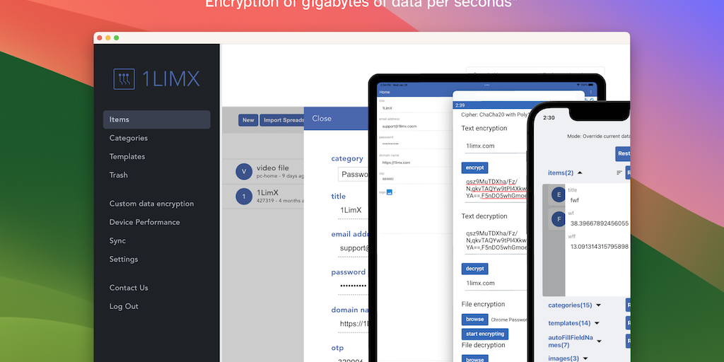 1LimX is an offline cross-platform application aimed to to provide a data manager such as files, images, passwords, credentials, notes,.. And they are secured by your master password, master key, biom