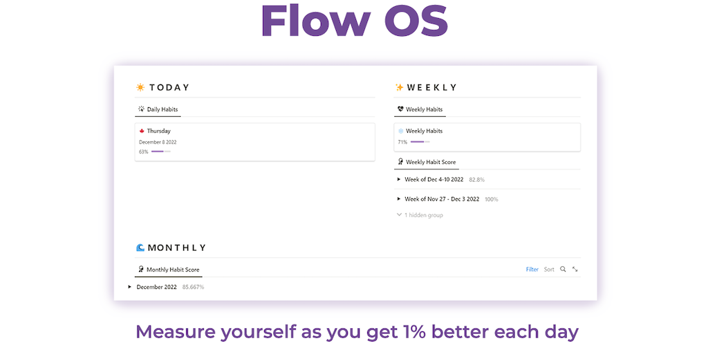 Flow OS is a Notion habit tracker with entries that automatically refresh each day! The built-in scoreboard compartmentalizes your Daily, Weekly, and Monthy habit scores, and shows you exactly where y