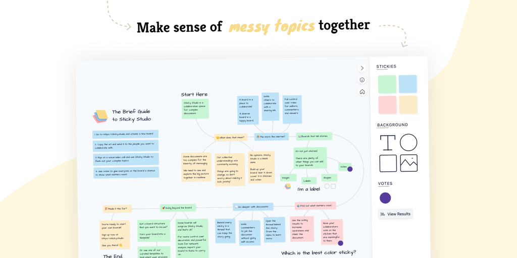 Sticky Studio is a collaborative whiteboard that helps people make sense of messy topics together. See the big picture by emphasizing how stickies are connected and go deeper with discussion threads on each sticky.