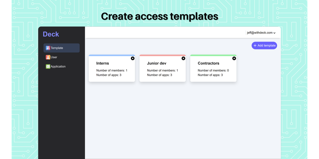 Deck is a web app to help you easily grant access to cloud applications like Slack, Atlassian Cloud, Google Group for your teammates. With our predefined templates, managers can invite/remove users to