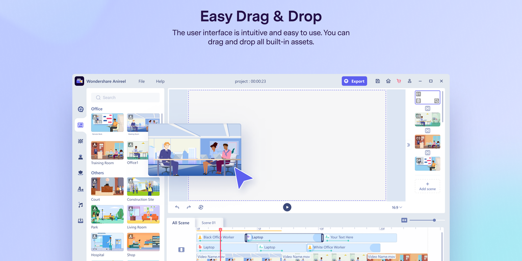 Anireel is a easiest tool for custom character animated video. Effortlessly make animated videos for marketing, knowledge sharing, eLearning and more with rich ready-to-use elements and scenes!
