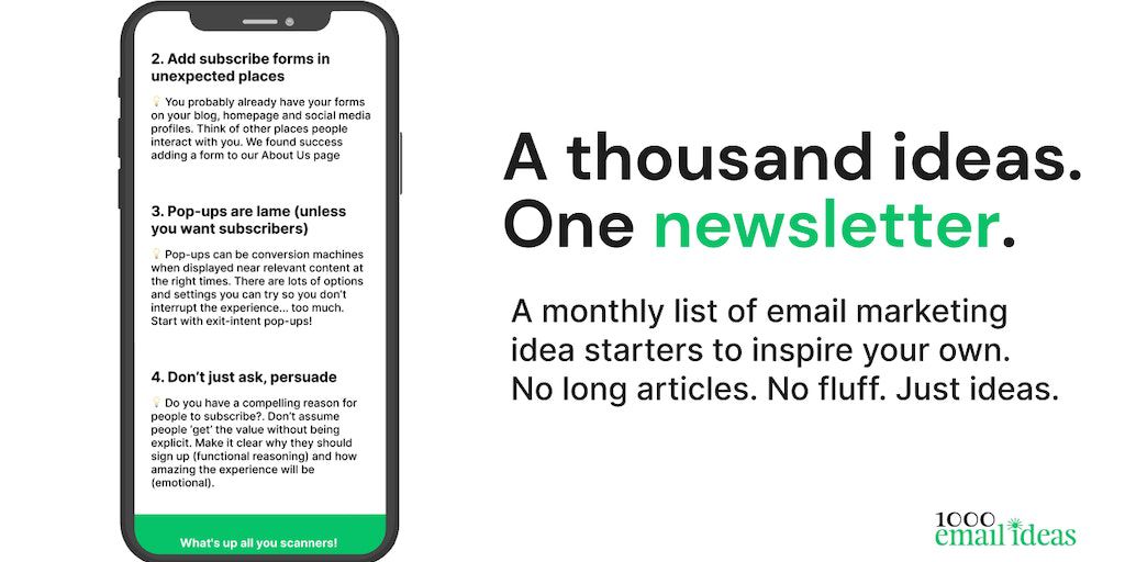 Free monthly newsletter with one purpose: To share email marketing ideas that help people create their own engaging email campaigns. It’s a quick list. No long articles. No fluff. Just ideas. The part