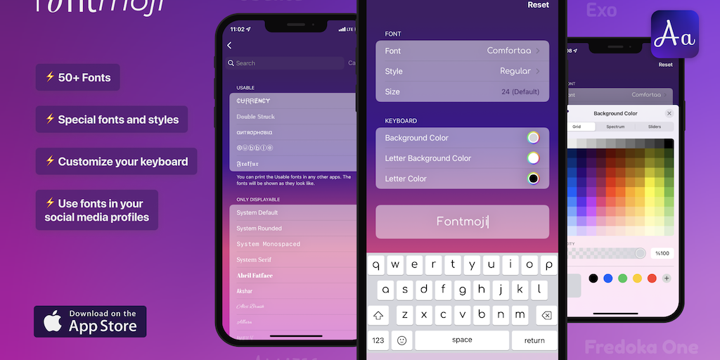 Fontmoji lets you reflect your own style on your keyboard for free. This app allows you to customize your keyboard with unlimited colors and 100+ fonts. Color your keyboard, select your font and creat