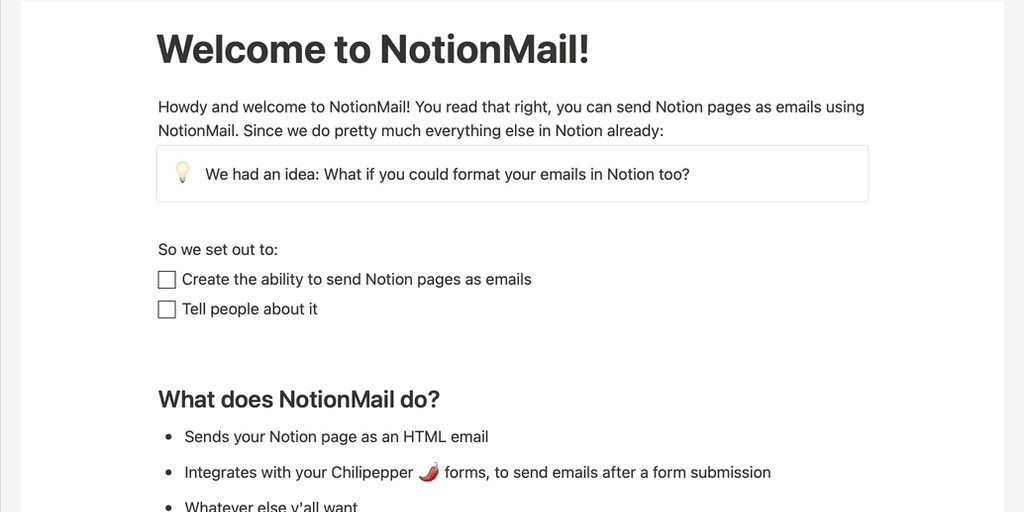 Send Notion pages as Emails ✉️ ⚡ Build your email in Notion with blocks you know 🛠️ Automate with tools like Chilipepper to send emails from form responses 💰 Save over 70% when compared