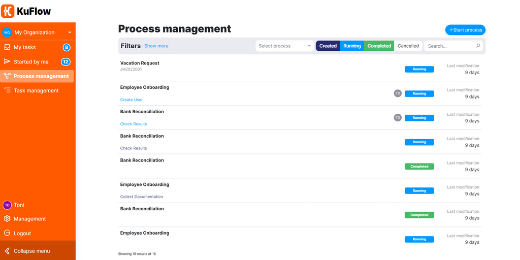 KuFlow is a developer-oriented workflow engine, on which to design and execute business processes. An orchestrator of tasks, both human and automated, built by developers for developers.
