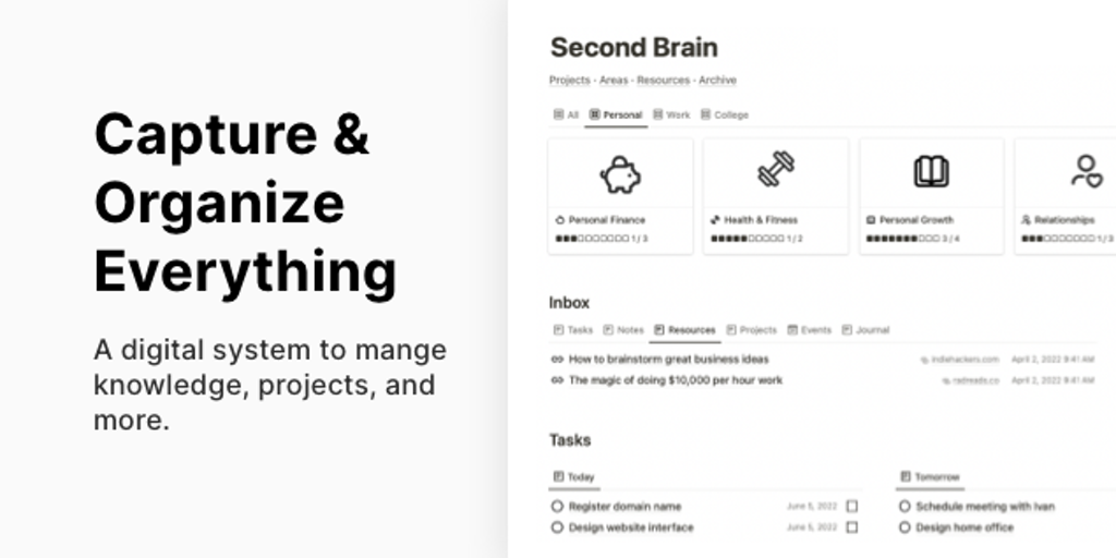 Second Brain is a digital system to capture and organize everything in one place, helping you manage your notes, resources, projects, goals, and more.
