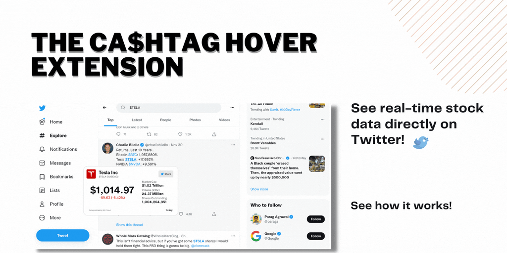 Finance Twitter 💸 is ever growing and cashtags are frequently used to talk about stocks. 🚀 We created this extension because we want to make the experience of using stock cashtags on Twitter much rich