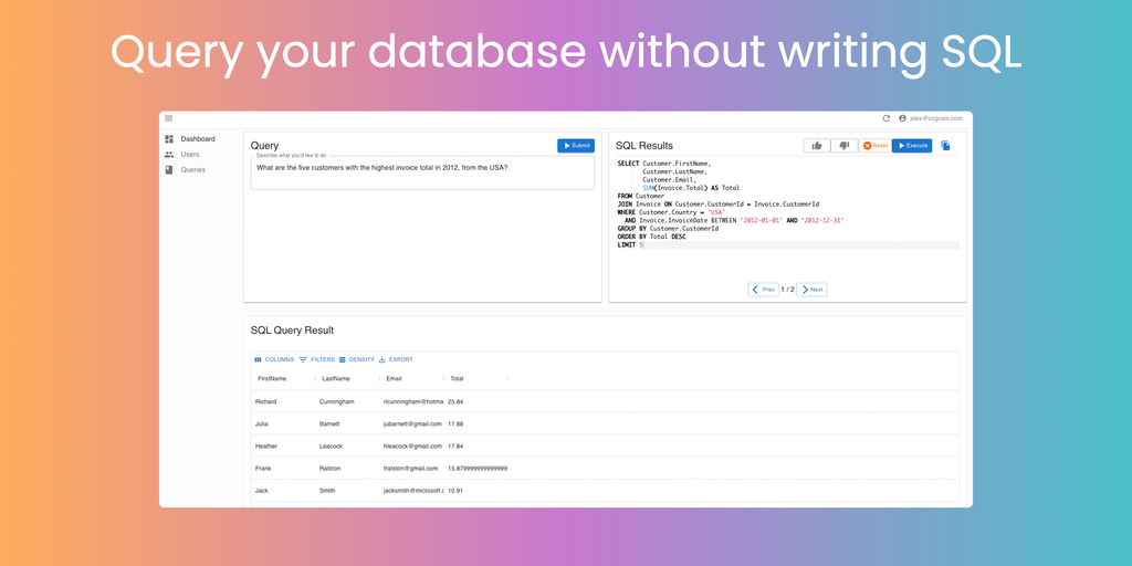 Cogram lets anybody query databases without writing SQL. In less than a minute you can connect your database and start asking questions in plain English—Cogram translates these into database queries a
