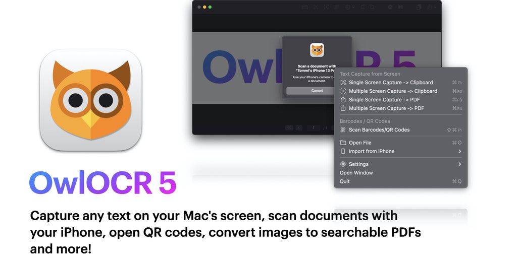 Grab any text on the screen, convert images or scans to searchable PDFs, open QR-coded URLs with a few clicks, and for the first time in OwlOCR 5 — use a command line interface to integrate OwlOCR int