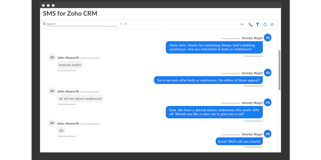 Emails often get ignored - SMS doesn't. Smooth Messenger lets you send SMS from Zoho CRM: conversational SMS, automated SMS, bulk SMS - we've got you covered. The UI is similar to SMS apps on your pho