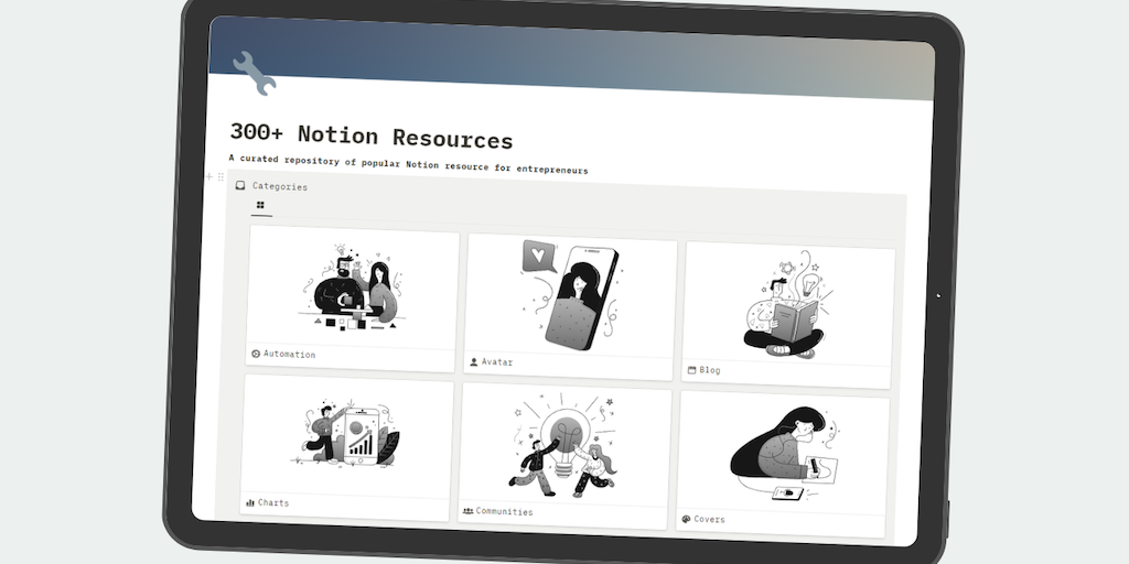 Unleash the power of Notion with a repository of 300+ resources. They are divided into the following categories: Automation Avatars Blogs Charts Communities Covers Extensions Forms Icons Illustrations