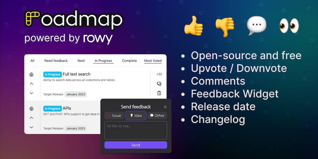 Gather customer feedback on upcoming product features. Fully open-source, customizable, and free 💜 Share roadmap publically or with a closed set of users. Customers can upvote/downvote, add comments,